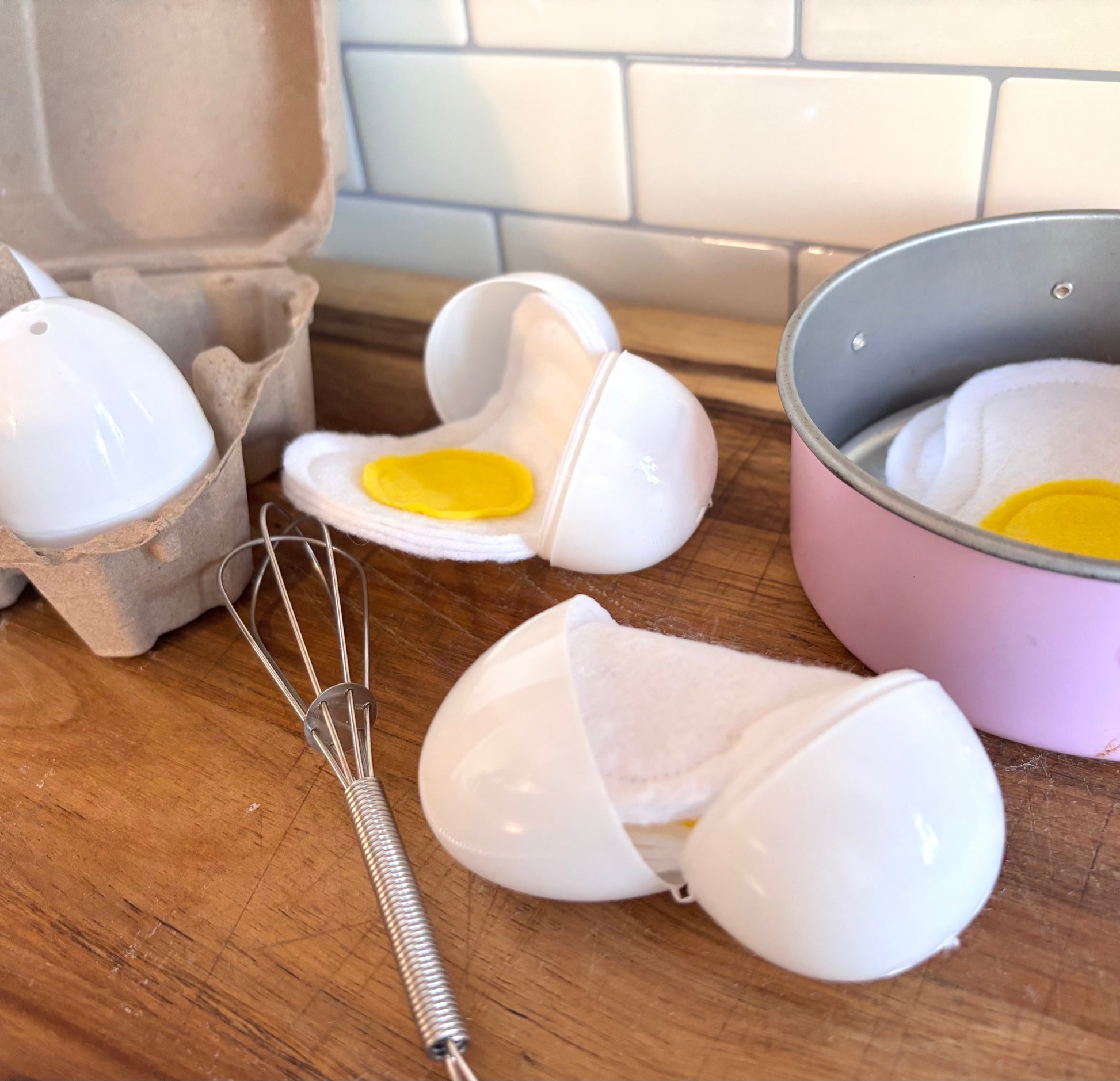Each box includes four crackable plastic eggs, hiding mini felt fried eggs inside. Perfect for imaginative play and learning about foods.
