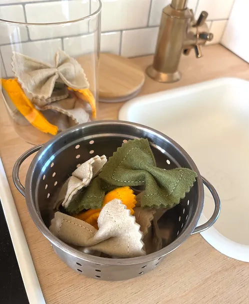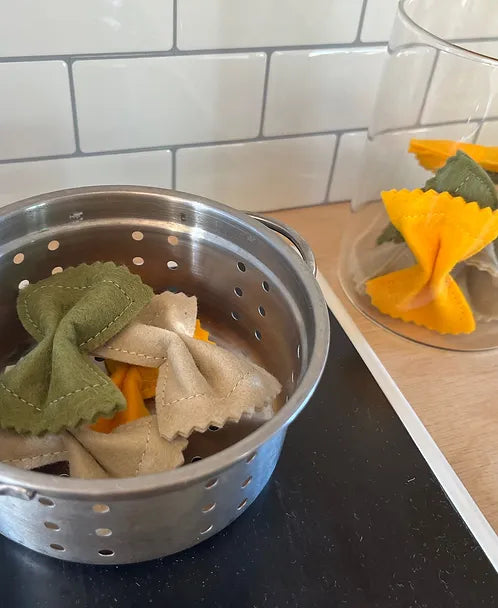 Indulge in a delicious make-believe meal with these handmade felt pasta bows! With a trio of fun colours - mustard, plain, and spinach - in a cute gift box, this is the perfect present for any imaginative child.